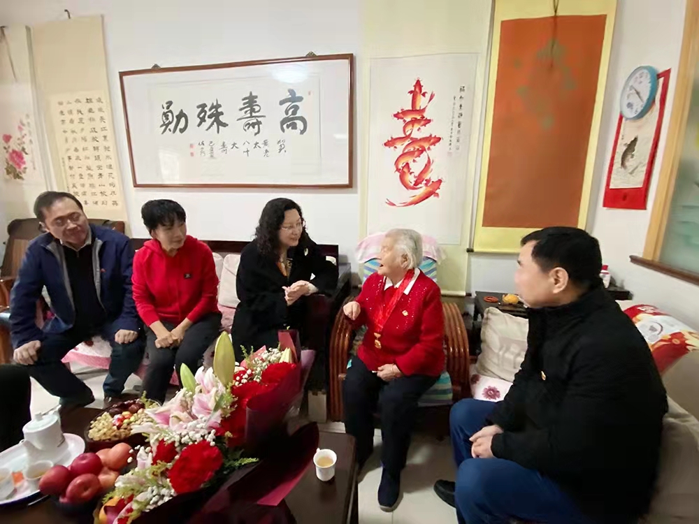 隨后黃蓓一行來到元首集團離休老干部、老黨員黃顯和家中,送上鮮花和慰問金,致以佳節祝福,與黃顯和老人座談交流。93歲的黃顯和老人年輕時在湖南讀書期間就接受革命洗禮,秘密加入學校進步社團,在“白色恐怖”下開展愛國運動,轉業后在濟南針織廠辛勤耕耘近十八載,1982年4月離休,是名副其實的巾幗模范代表。黃蓓代表集團黨委感謝她為黨和企業做出的突出貢獻,對其在革命年代的英勇事跡表示崇高敬意,表示產發集團要傳承好老一輩不懼艱辛、敢于奮斗、無私奉獻的精神,凝心聚力、接續奮斗。