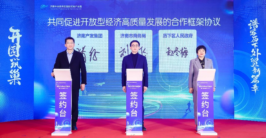 在入駐簽約環(huán)節(jié),濟南國商園區(qū)運營管理有限公司總經(jīng)理陳蕾與華潤置地中心項目負(fù)責(zé)人李靜宜簽訂了委托運營協(xié)議;劉燕飛、趙冬梅、褚征分別代表濟南市商務(wù)局、濟南市歷下區(qū)人民政府、濟南產(chǎn)發(fā)集團共同簽署《共同促進開放型經(jīng)濟高質(zhì)量發(fā)展合作框架協(xié)議書》;王紅、楊傳軍、趙治文、楊福濤、王海清、黃蓓、邵丹丹共同按下啟動開園按鈕,宣告濟南中央商務(wù)區(qū)國際貿(mào)易產(chǎn)業(yè)園正式開園。
